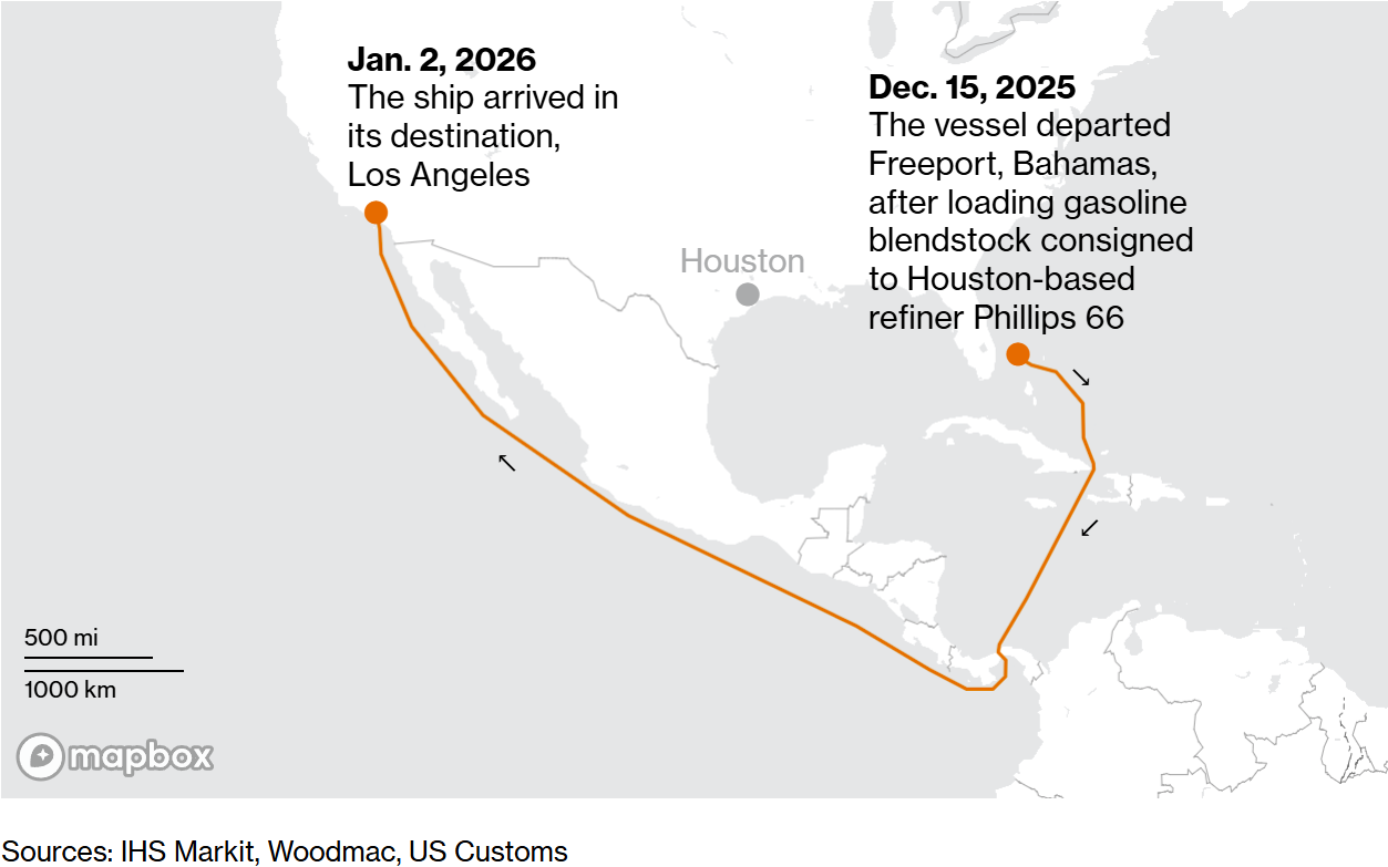 Recent refined product shipment from Houston to Bahamas to California. Courtesy Bloomberg News.