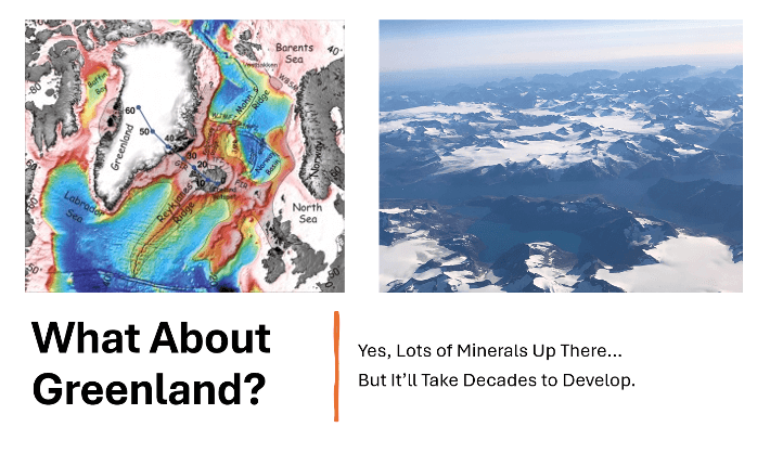 And not to get too far-fetched, but what about Greenland? Well, the place hosts many great deposits in those ancient rocks, but they’re also in a distant locale with the harshest of climatic conditions. Here’s a slide of Greenland, along with a photo I recently took of the southern tip of the place, as I flew over on an Iceland Air jet aircraft.