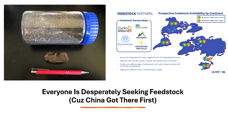 Meanwhile, Chinese geologists and purchasing agents have scoured the world and locked up many of the best known deposits, so even acquiring basic feedstock will be an uphill fight. Again, another slide from Nashville: