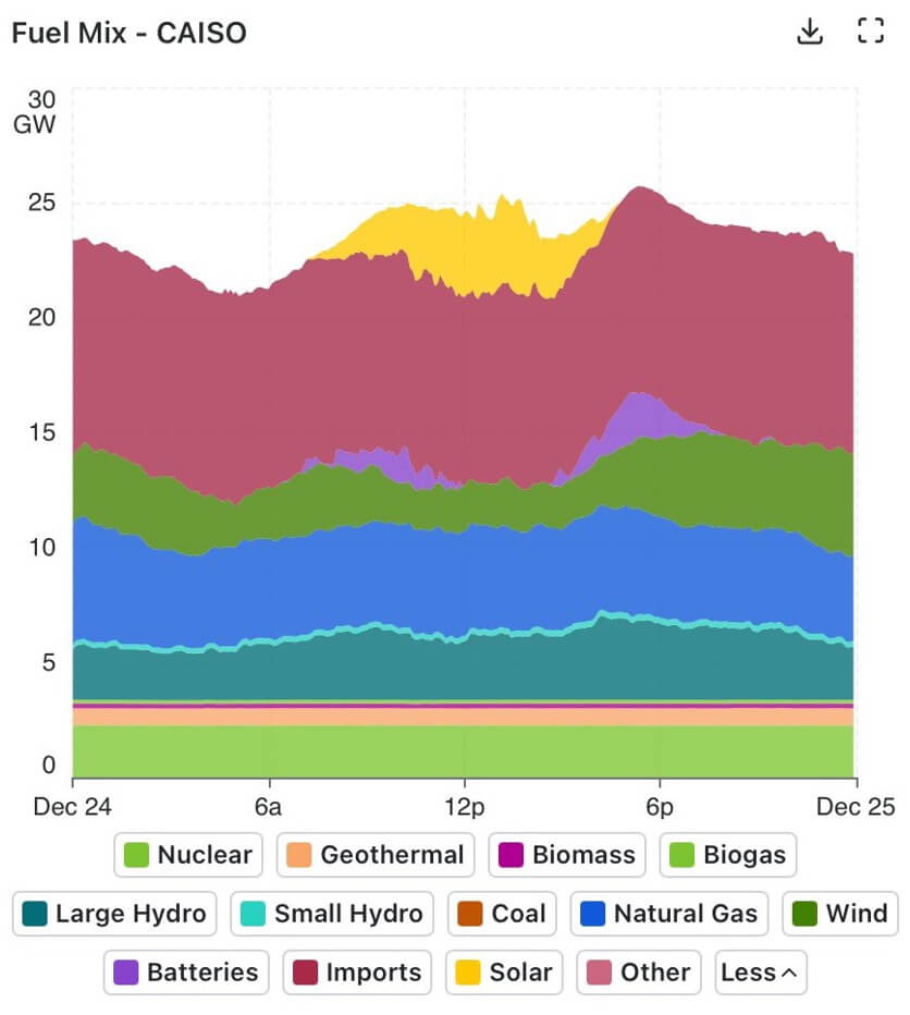 On this last point, I can’t help but note what happens to the California grid on days when there’s a storm and the sun don’t shine, like this past December (Christmas Day, in fact):