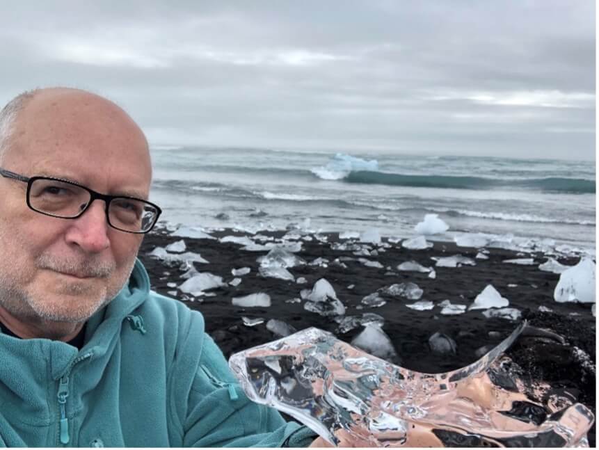 Your editor on the south coastline of Iceland, at “Diamond Beach,” holding ancient glacial ice. BWK photo.