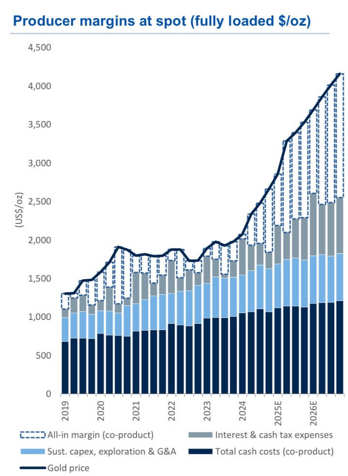 But now in 2025, let’s say that mining that same ounce of gold costs $2,100 (yes, inflation in labor, materials, energy, etc.), but the sales price is $4,100. Well, the profit has quadrupled from $500 to $2,000, or 4x what it was just a couple of years ago. Here’s a chart to help visualize things.
