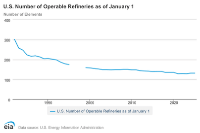 According to the EIA, the U.S. had 135 working refineries as of January 1, 2026. This is down from about 300 back in the early 1980s. Here’s that chart:
