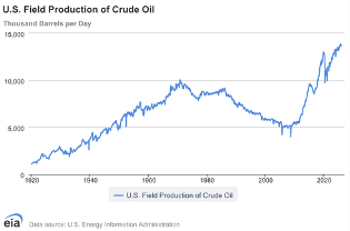 U.S. oil output since 1920. Courtesy Dept. of Energy/EIA.