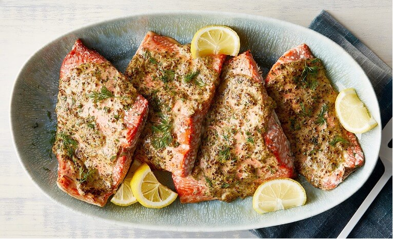 “I’d like a couple of those salmon filets,” and I pointed to a tray behind the glass.