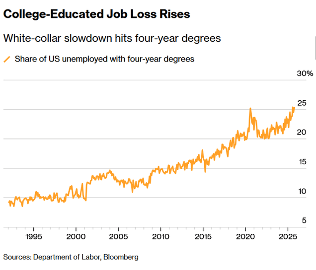 As you can see, over 25% of America’s unemployed are college grads, an all-time high. The trend is up sharply in just the past couple of years, and has been rising for a generation and more.